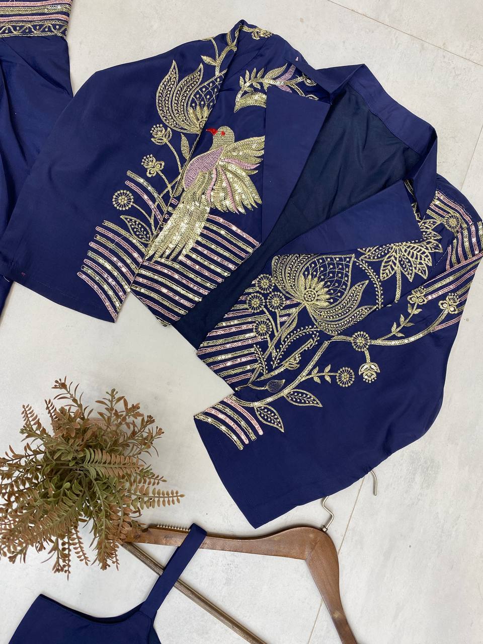 DESIGNER INDO WESTERN THREE PIECE WITH SEQUENCE EMBROIDERY WORK KOTI , BLOUSE WITH DRAPED SKIRT*