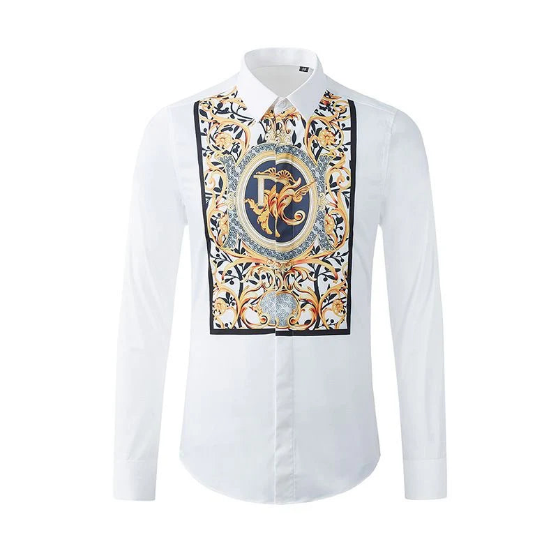 Luxurious White Long-Sleeve Shirt with Ornate Golden Motif
