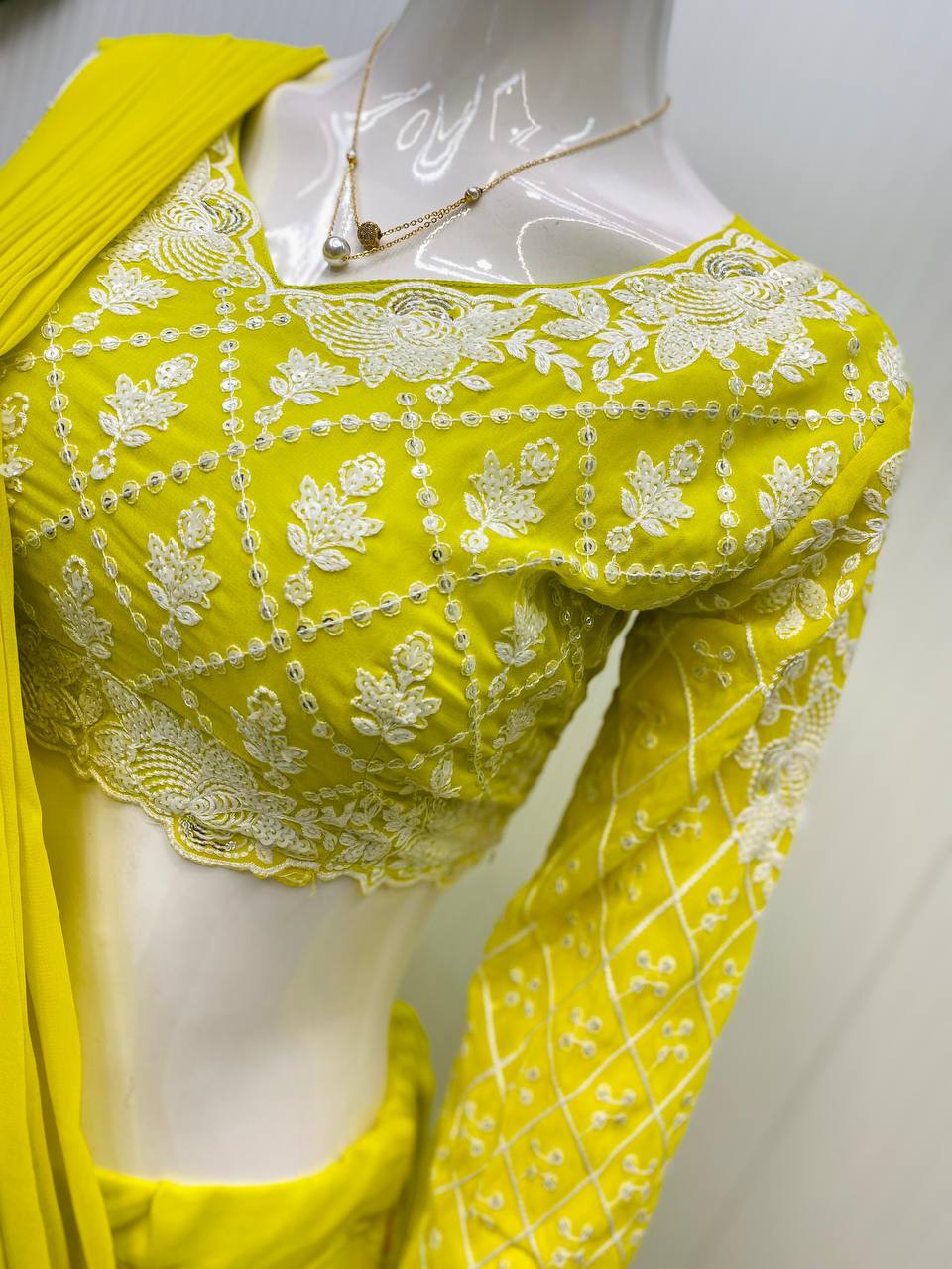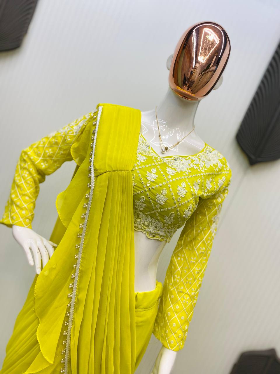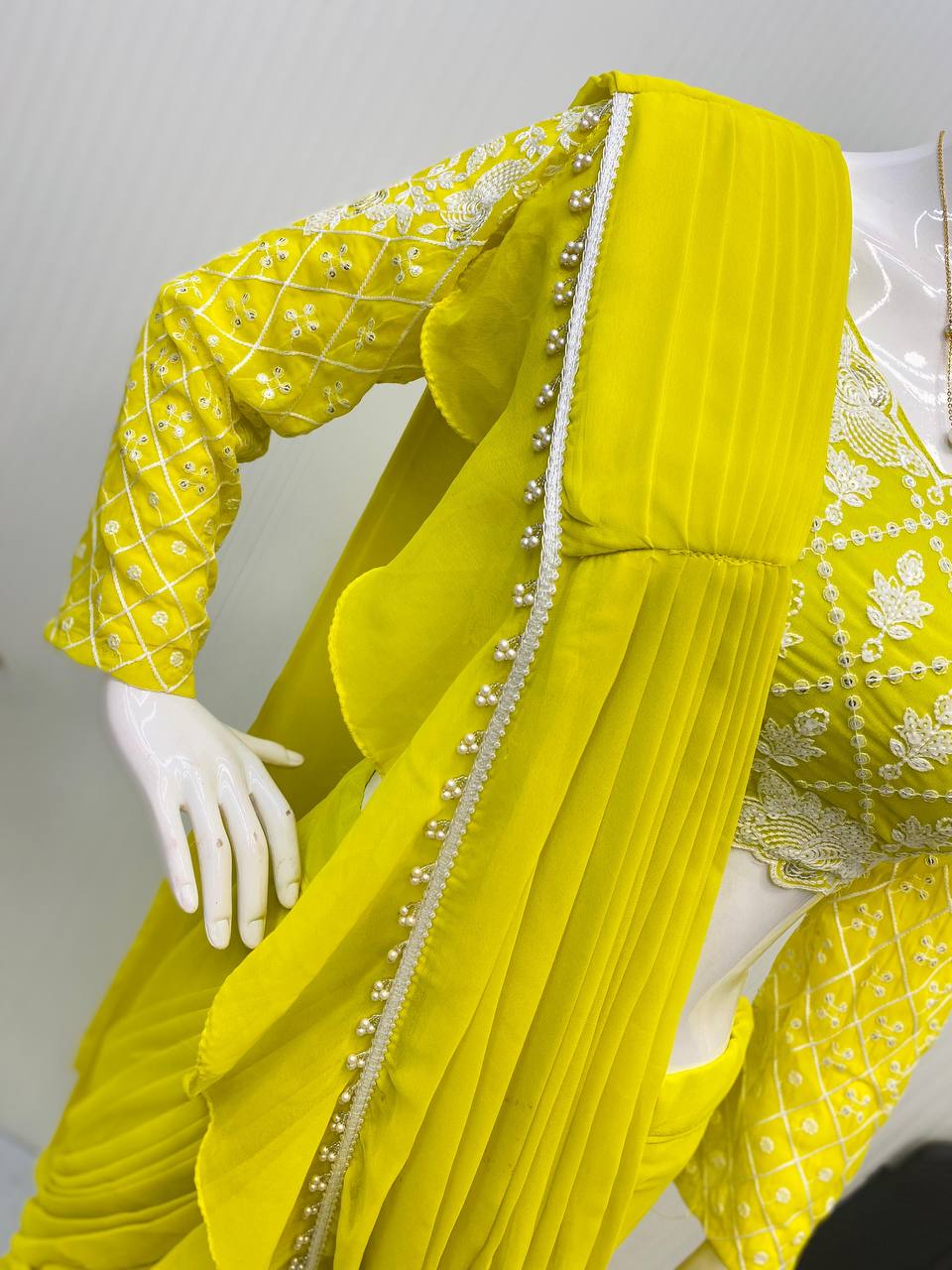 NEW READY TO WEAR RUFFLES SAREE WITH LONG SLEEVES BLOUSE IN LEMON YELLOW COLOR