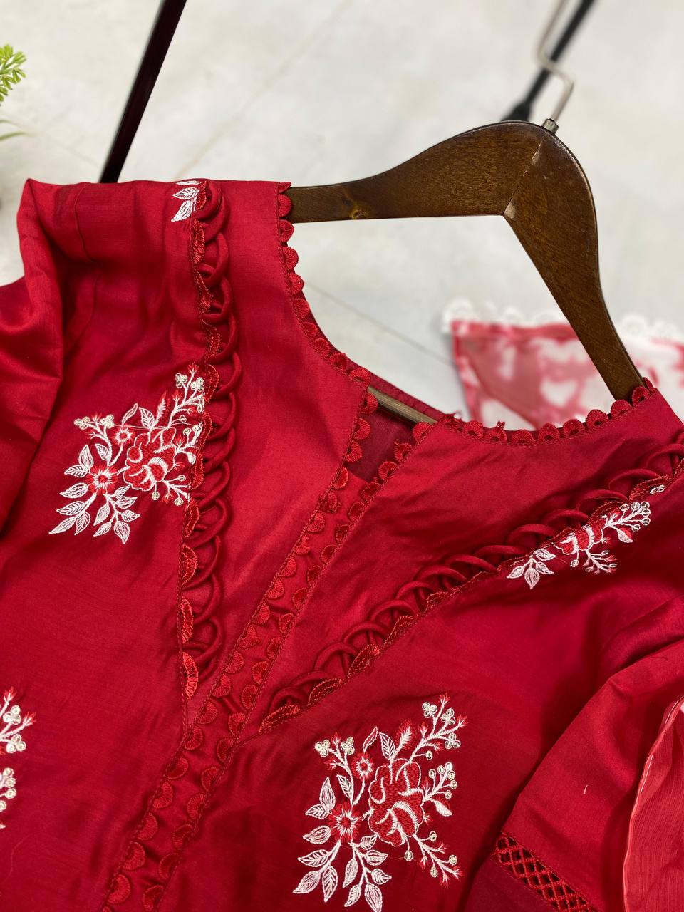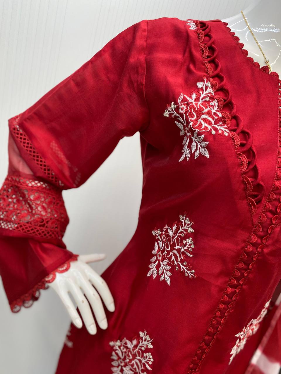 DESIGNER WEAR EXCLUSIVE SUIT IN ROMAN SILK FABRIC TOP AND PANT WITH SILVER CHIFFON DUPATTA